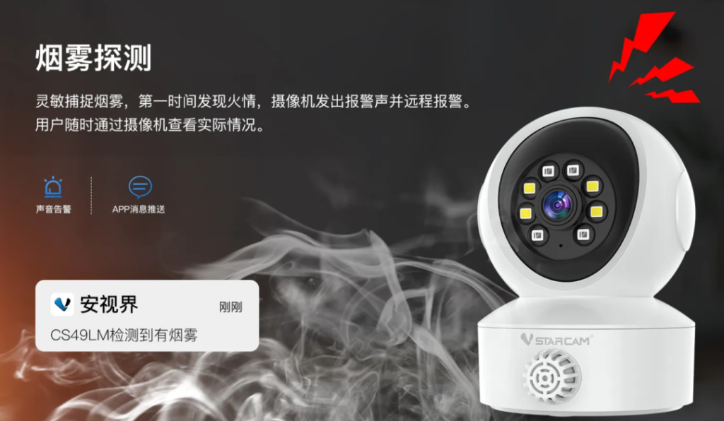 烟雾探测摄像机系列(CS49LM/CG49LM),搭载烟火识别算法,可灵敏识别烟雾火源点、精准检测天然气 / 液化气泄漏,险情发生迅速远程告警,精准预警,给家全方位安全守护。