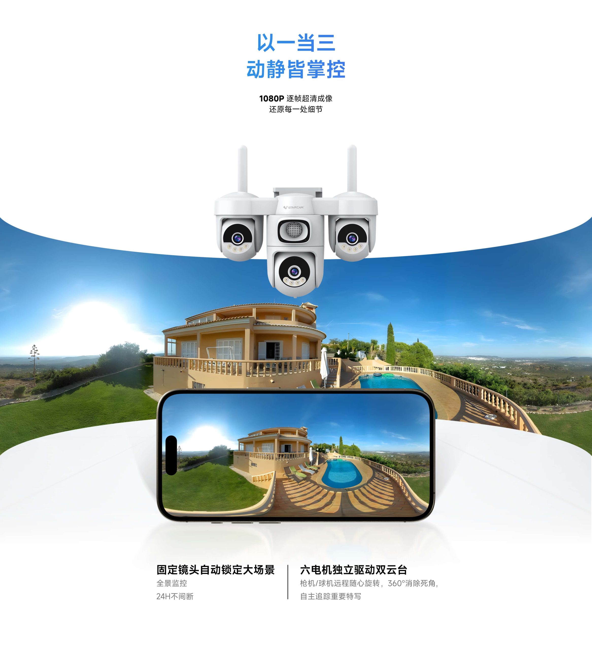 | ✮超大广角监控,六电机云台操控,灵活旋转,360度无遮挡 | ||